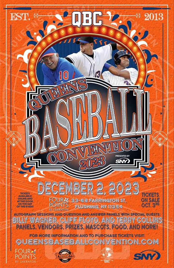 Tickets: Available at QueensBaseballConvention.com or EventbriteJoin Mets fans for the ultimate fan fest at the Queens Baseball Convention (QBC) 2025, a celebration of all things New York Mets, held at the Four Points by Sheraton in Flushing, Queens! Organized by passionate fans for fans, QBC combines the excitement of a Comic Con with the nostalgia of a baseball card show, offering a fun-filled day to kick off the offseason and fuel your Mets fever.Event Highlights: